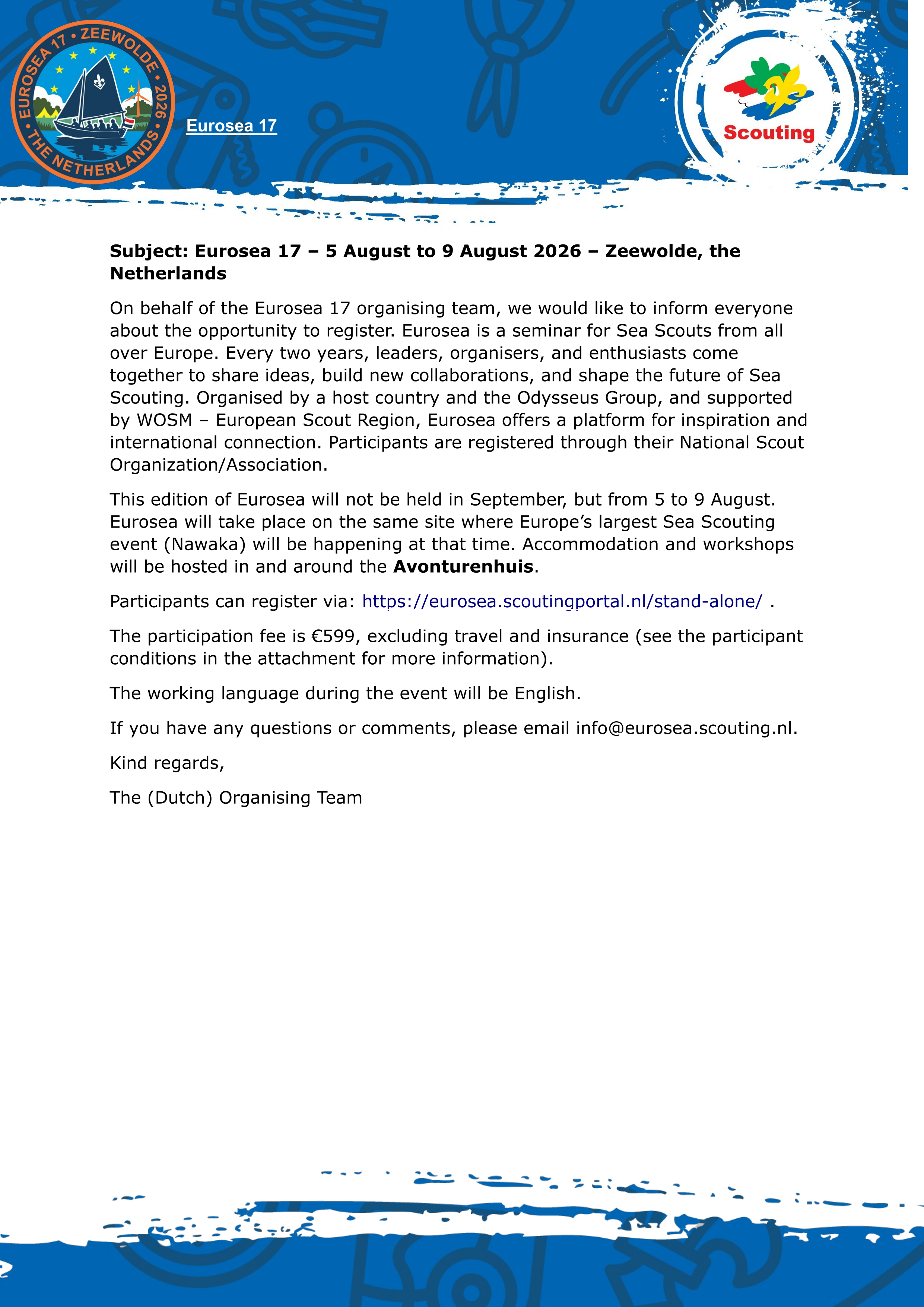 Registration is now open. Via the link below, you will be directed to a page containing the information from the email that has been sent, along with additional links to the Participants’ Terms and Conditions (in English) and the Scouting Netherlands Code of Conduct (in English).